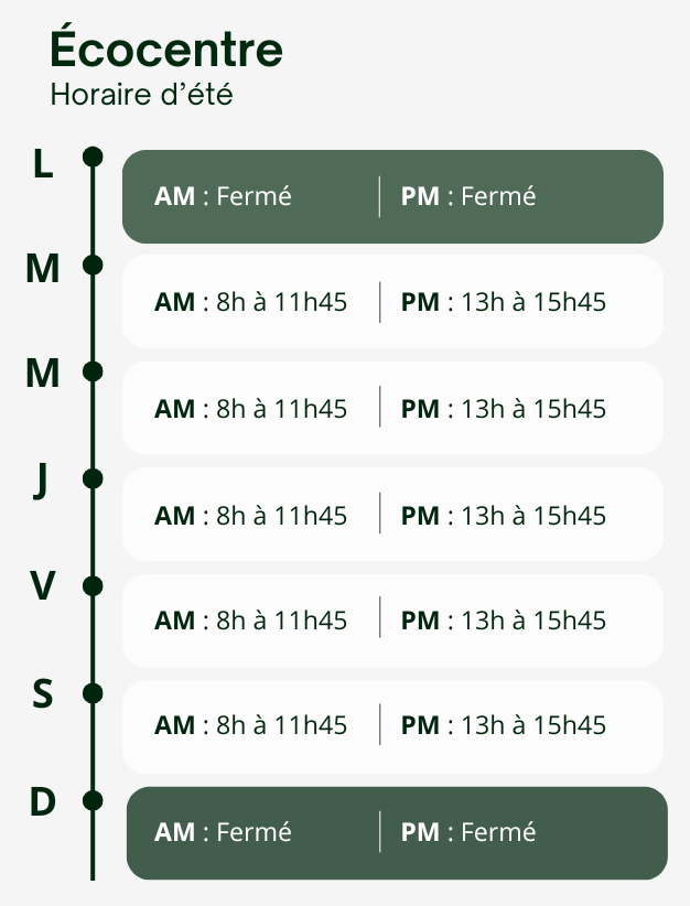 En dehors des collectes spéciales concernant les encombrants, les branches, les herbes et feuilles, les sapins ou autres matières dont vous voulez vous débarrasser et qui ne vont pas dans les collectes régulières, vous pouvez vous rendre à l’Écocentre pendant les heures d’ouverture en présentant une preuve de résidence.